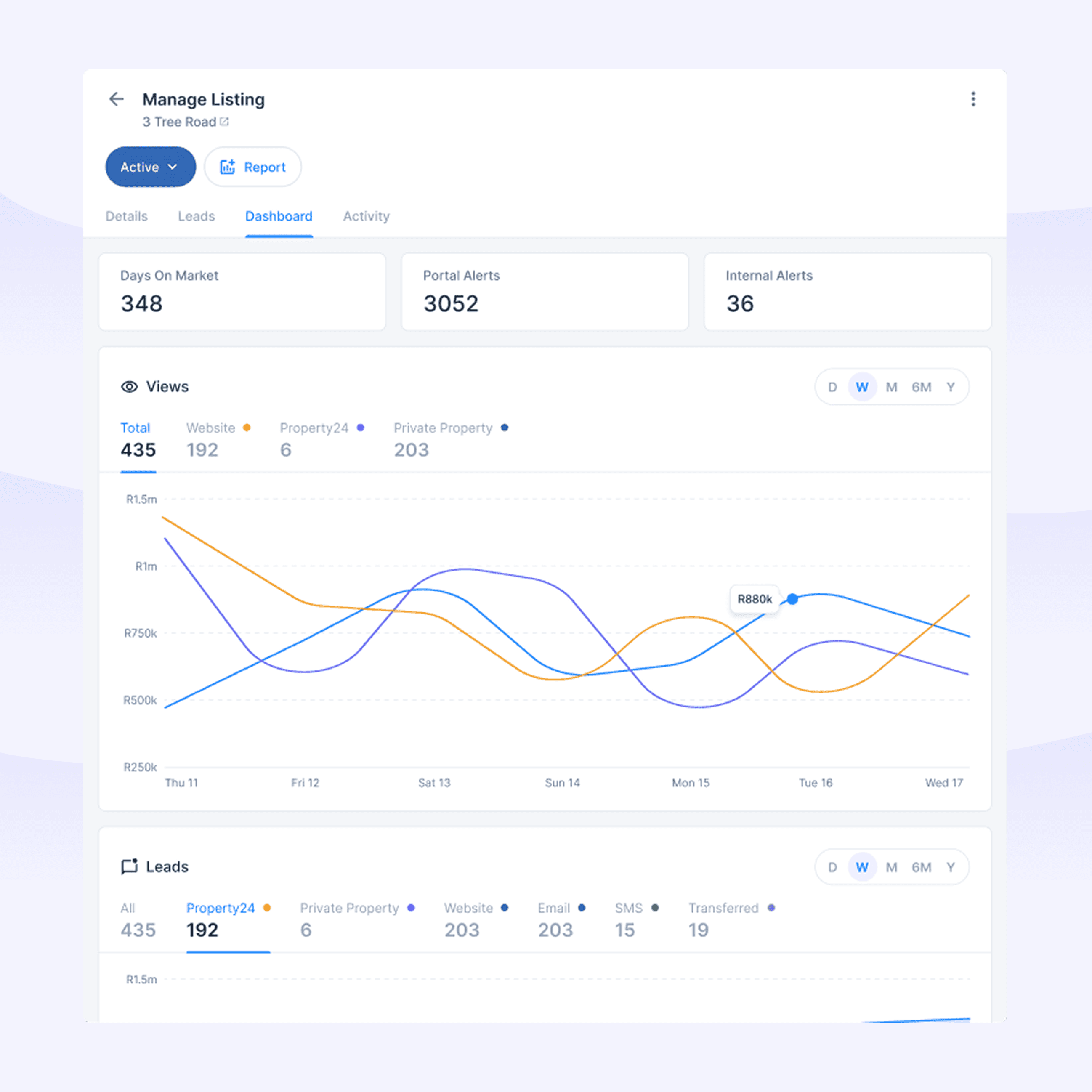 The Listing Performance Dashboard gives agents and managers a complete view of how each property is performing across portals, website traffic, and internal activity. Identify high-interest listings, spot slow movers early, and make smarter marketing decisions backed by real data.