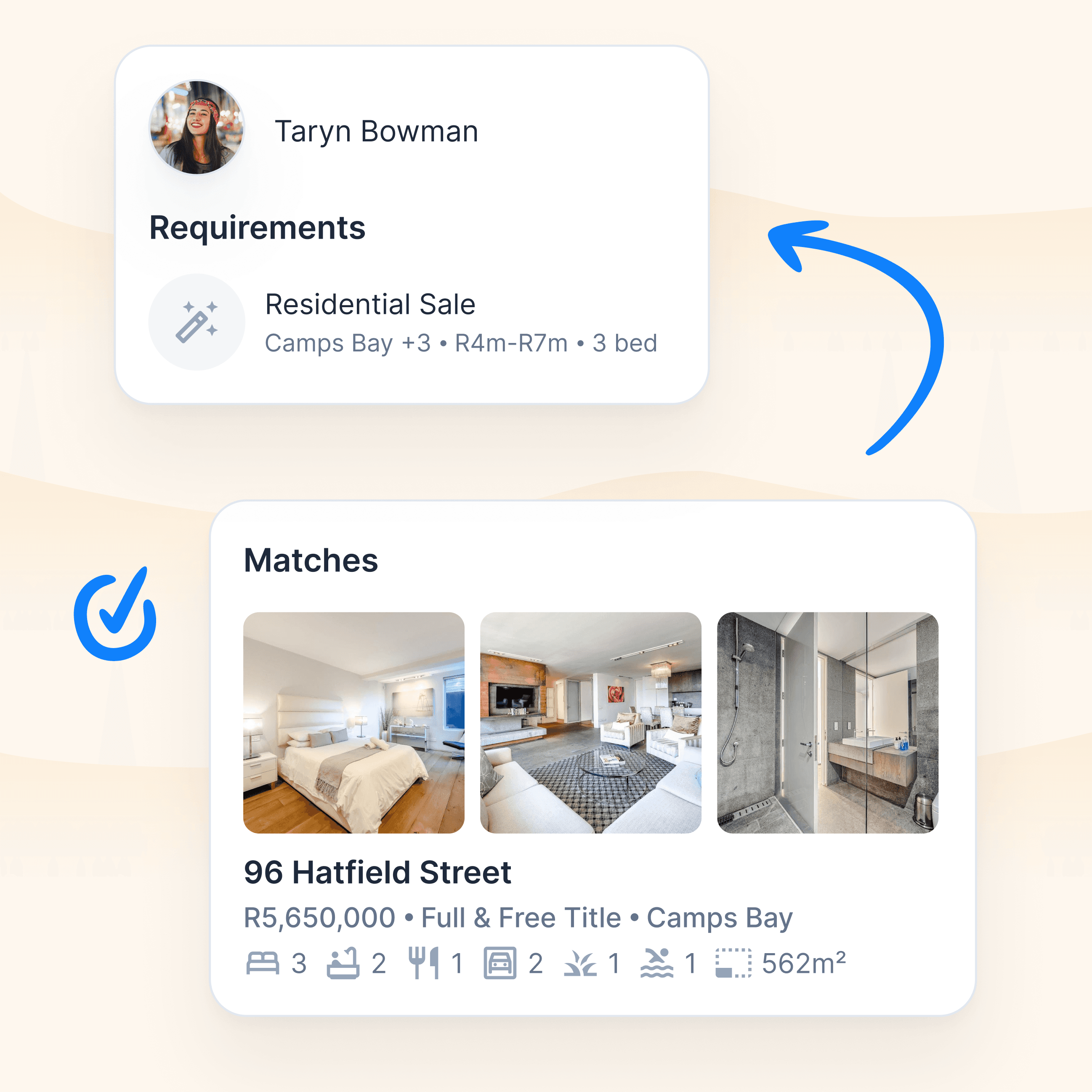 Property Buyer Matching automatically pairs your listings with buyers who meet the right criteria. Filter by budget, location, features, and preferences to instantly see who’s a fit. Ideal for fast follow-ups, targeted marketing, and impressing sellers during valuations and mandates.